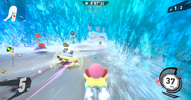 Y si hablamos de corredores, podemos elegir entre una amplia variedad de personajes del universo Kirby y también de vehículos flotantes, cada uno con características únicas que influyen en la velocidad, el manejo y la resistencia, parámetros que serán claves para quedarnos con la victoria, sobre todo en el modo City Trial, que llega muchísimo más completo. Aunque también es destacable el modo multijugador online que amplifica la experiencia con combates caóticos (por momentos excesivo) entre hasta 16 participantes.
