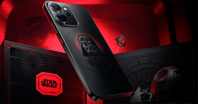 Dentro del empaque encontramos accesorios temáticos como un cargador con forma de casco de Darth Vader, un pin expulsor de SIM estilo colgante y un soporte para teléfono inspirado en la Estrella de la Muerte II. Además, el smartphone incluye fondos de pantalla exclusivos y animaciones basadas en escenas clave de la franquicia.