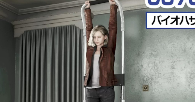 Una imagen promocional muestra a la protagonista Grace Ashcroft usando la barra de ejercicio, mientras que un comercial al estilo de infomercial japonés mezcla escenas del juego con presentadores que venden el set como si fuera un producto visto en televisión.