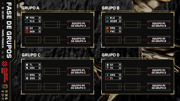 La Fase de Grupos (del 12 al 22 de septiembre) tendrá a los 16 equipos repartidos en cuatro grupos; cada grupo tendrá un equipo de las cuatro ligas internacionales de VALORANT. En esta fase, los equipos lucharán en un formato de eliminación doble y dos equipos de cada grupo avanzarán a la siguiente fase.