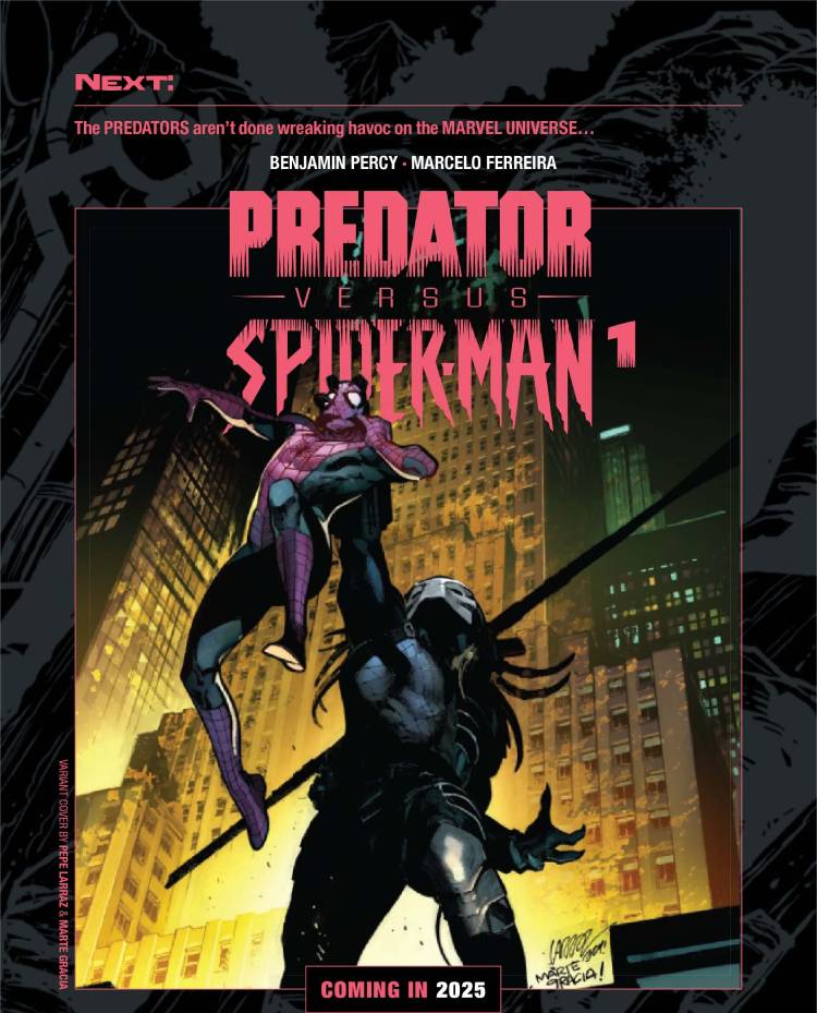En aquellas páginas se reveló que Predator vs. Spider-Man #1 será una realidad, con un lanzamiento durante el 2025. Ahora, Percy tendrá a Marcelo Ferreira en los dibujos para esta nueva batalla, con una portada realizada por Pepe Larraz y Marte Gracia que anticipa el complejo escenario para nuestro trepamuros favorito.