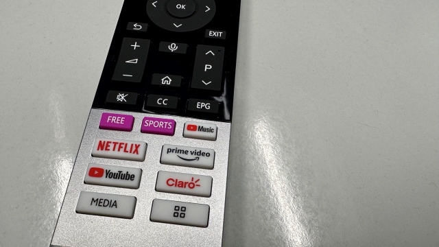 El control remoto es funcional pero las teclas se sienten algo endebles, de esas que uno sabe que si aprieta demasiado terminarán por romperse. Además, no es de tanto alcance pues cuesta operar el televisor si es que no se apunta directamente al infrarrojo. Sin embargo, es de fácil uso e incluye botones dedicados para Netflix, Prime Video, YouTube, Claro (¿?) y YouTube Music, además de otro para revisar multimedia en el equipo, imaginamos vía USB fotografías o videos.