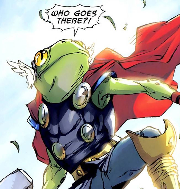 La segunda, "Throg", es un humano llamado "Simon Walterson" que fue transformado en rana por un hechizo, tomando el nombre de "Puddlegulp". Siendo digno, logró levantar un pedazo del Mjolnir -que se transformó en una versión en miniatura, el Frogjolnir- y se convirtió en "Throg", la Rana del Trueno, quien también es miembro de los "Pet Avengers". ¡Ah, los cómics!