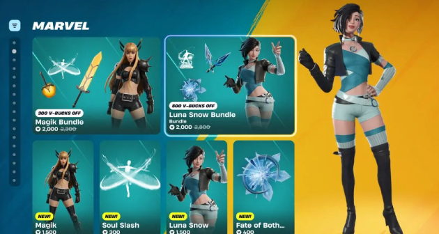 La nueva colaboración Fortnite-Marvel incluye dos lotes en la Tienda de objetos del juego, uno para cada personaje: el lote Magik y el lote Luna Snow, ambos teniendo un precio de 2.000 V-Bucks, aproximadamente 17.050 pesos chilenos.
